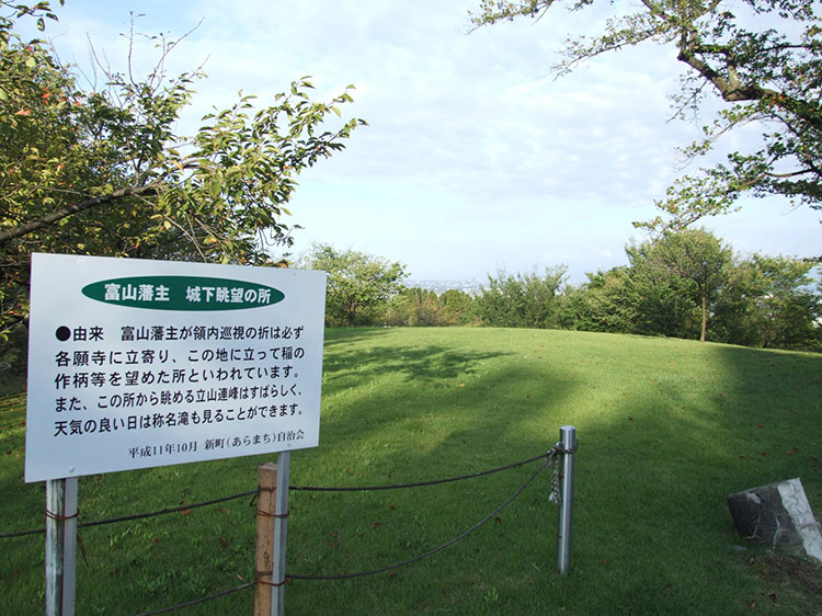 ▲富山藩主が城下を眺望した場所。婦中ふるさと創生館のそばにある。晴れた日には遠く称名滝も見えるという。