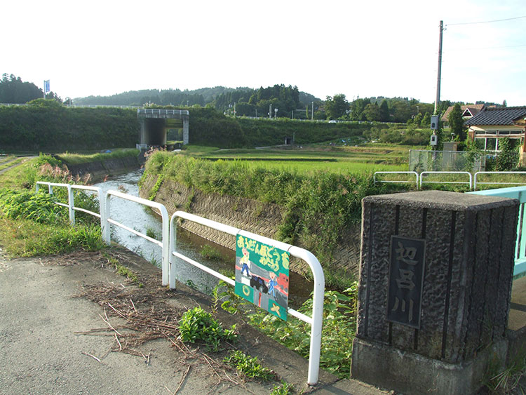 ▲辺呂川は小さな川だ。水路から田に水を揚げる龍骨車(りゅうこつしゃ)のことを俗に「ベロ」と称す、と「肯搆泉達録」にある。六治古の3番目の弟の羽根児古(はねこのこ)がいた羽根村の田の稲が日照りで水が涸れたため枯れそうになった時、六治古の妻が龍骨車を作り、この川から水を揚げて救ったという。