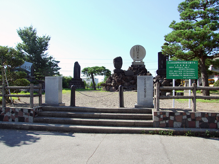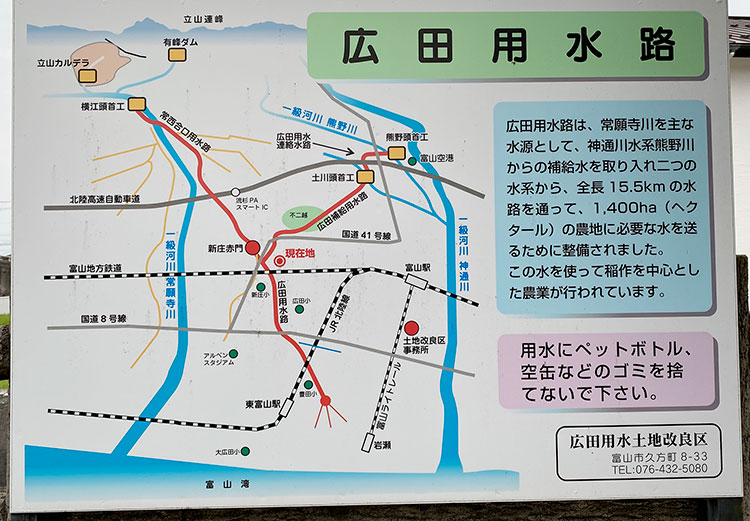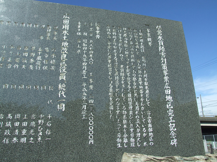 広田用水を記念した公園で、入って左側の「永遠なる水の恵み」と刻まれた大きな石板からは用水に対する熱い思いが伝わってきました。ちなみに、この石碑は、昭和49年着工、平成5年竣工の「県営水質障害対策事業広田地区完工記念碑」です。説明文には、『本地区用水路は、熊野川及土川を取水源として、富山市南部地区の市街地を通過して、富山北部の農業地帯をかんがいしているが、水路は殆ど市街地を横断しており都市化と共に汚濁水の流入が増大し粗大塵の堆積と相まって水死事故等多く維持管理並びに農業労働環境は毎年悪化したので、水質障害をきたしている都市排水を分離し又熊野川より取水する清流を直接流下せしめる事業によって労働生産性の高い安定した農業経営をしうる基盤を完備した。』とあります。また、公園を入って右側には、安政5(1858)年の飛越地震の後の大洪水で犠牲になった用水関係者を祀った碑もあります。目立たない所にありますが、歴史が感じられる場所です。