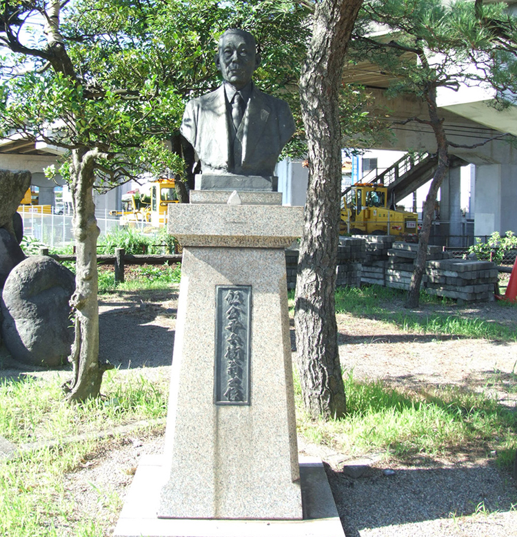 ▲記念公園正面。奥に3つの碑が立っている。中央の丸い碑には、若槻総理大臣の名前がある。