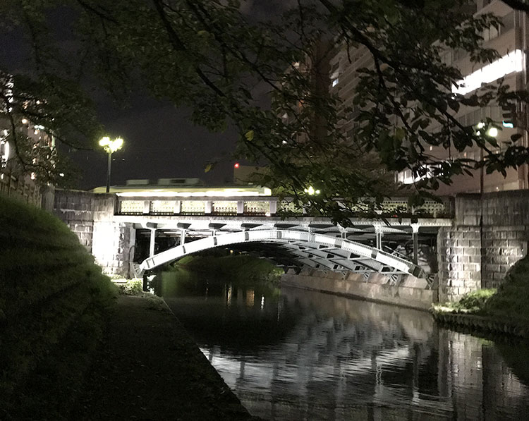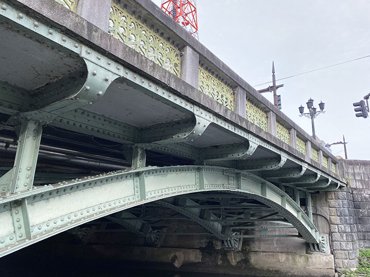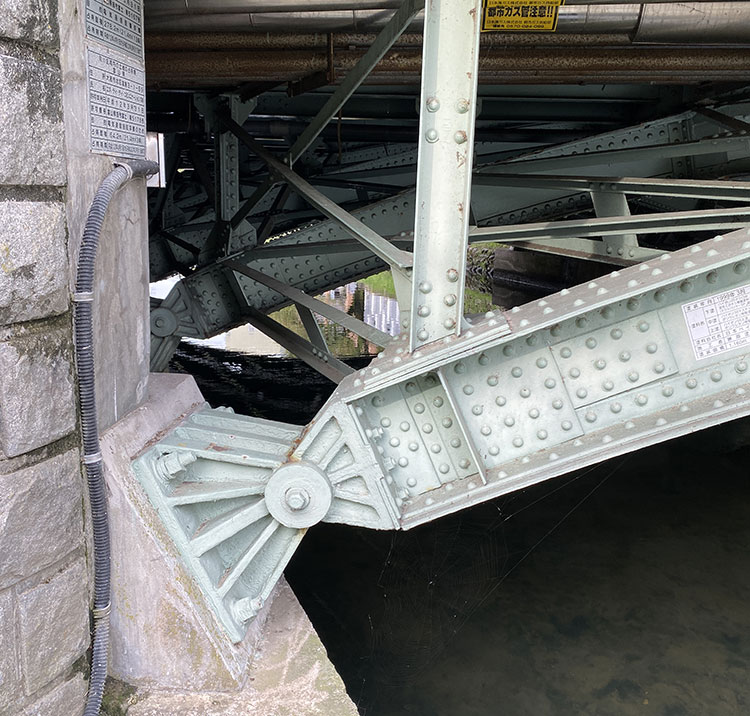 現在の桜橋は、昭和10年(1935年)に竣工しました。上路式鋼2ヒンジアーチ橋とよばれ、左右2つのヒンジ(蝶番)によって支えられています。橋長は15.5m、幅員は21.9mと長さより幅の方が広く、かつ川に対して斜めに架けられています。リベット打ちの鋼製アーチが美しい橋です。
