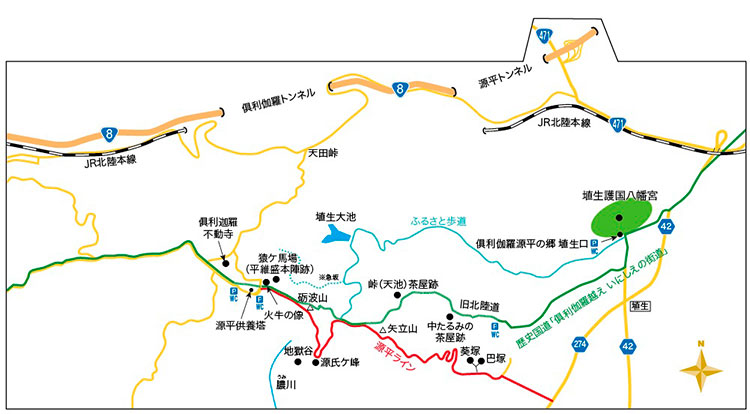 まずは、巴塚や義仲軍が「火牛」とともに夜討ちをかけ平家軍を転落させた「地獄谷」等が点在するドライブコース「源平ライン」を走ってみよう。俱利伽羅源平の郷 埴生口に車を停め、護国八幡宮に参拝したら、さあ、出発。県道274号線に入って南下し、右折し、「源平ライン」へ。途中、巴塚の案内板がある。数台停められる場所があり、そこから徒歩数分だ。更に進むと、平家軍の陣地を義仲軍が占領したことから名付けられた源氏ケ峰、地獄谷がある。そして、俱利伽羅合戦本陣へ。火牛の像にも出会える。すぐそばに、合戦で犠牲となった源平両軍の兵士の霊を弔うために建立された源平供養塔もある。時間があれば、「いにしえの街道」を歩いてみてもいいだろう。