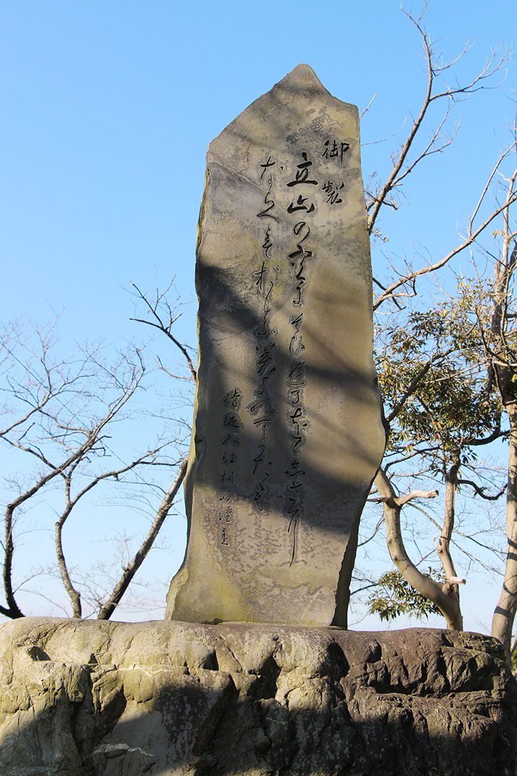 また、少し上がった丘の上には、大正天皇の漢詩碑と、昭和天皇の御製歌碑が建てられている。大正天皇は、皇太子の時、呉羽山頂に登られ、秀吉の成政攻めの歴史を回顧しながら、中越(越中)の全景を見渡され、「眺望、此の如きは多くを得がたし。真に是れ北国の好き公園」と絶賛された。現在の碑は、平成14年に修復再建されたもの。また、昭和天皇の御製碑は、昭和33年、国民体育大会のための御来県を記念して建てられたもので、立山雄山山頂直下の三ノ越の巨岩に刻まれた歌碑と同じ碑だそう。