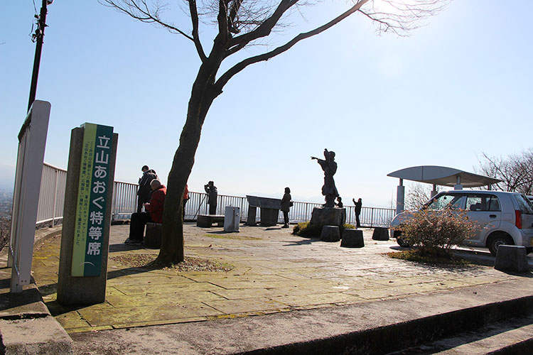 この場所は、旧富山市の時に選ばれた「立山あおぐ特等席」11カ所のうちの1カ所に選定されている。晴れていれば、古くから神の宿る山々として人々に崇められてきた立山連峰の雄大なパノラマを望むことができる。すぐそばに数台停められる駐車場があるほか、少し下ったところに10台程停めることができる。平成13年には、立山開山・佐伯有頼少年像が建てられた。