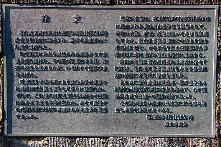 今回ご紹介する場所は、このうち、官立富山薬学専門学校、そしてそれに続く富山大学薬学部があった場所です。碑文によると、富山薬学専門学校は大正9年(1920年)12月に、それまでの県立から官立に移管され、大正10年4月、奥田のこの地で開校したということです。そして、それから30年にわたり特色ある有名校として実績を保ち続けました。その間の昭和20年8月には、戦災で校舎を焼失しましたが、いちはやく復興の実をあげました。