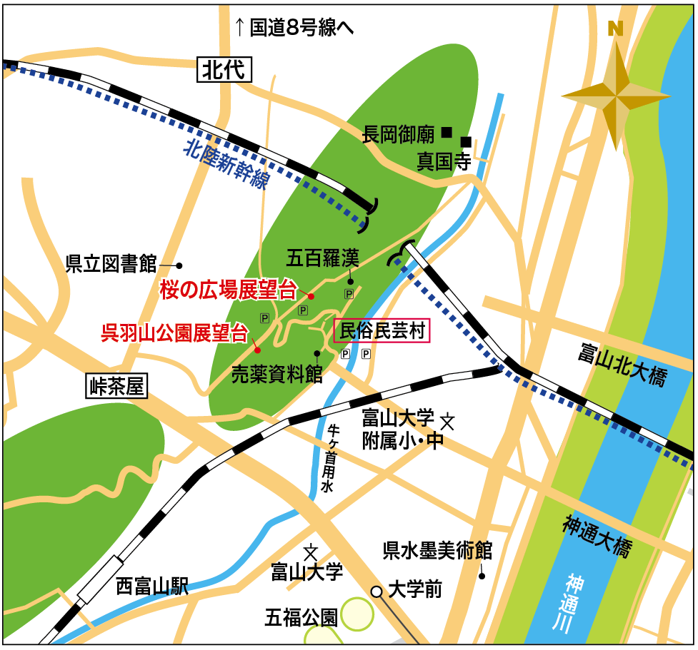 この展望台からは、北陸新幹線の高架をより近くから見ることができ、反対側からは遠くに富山湾も望むことができます。「桜の広場」というだけあって、4月には美しい桜を見ることもできそうです。