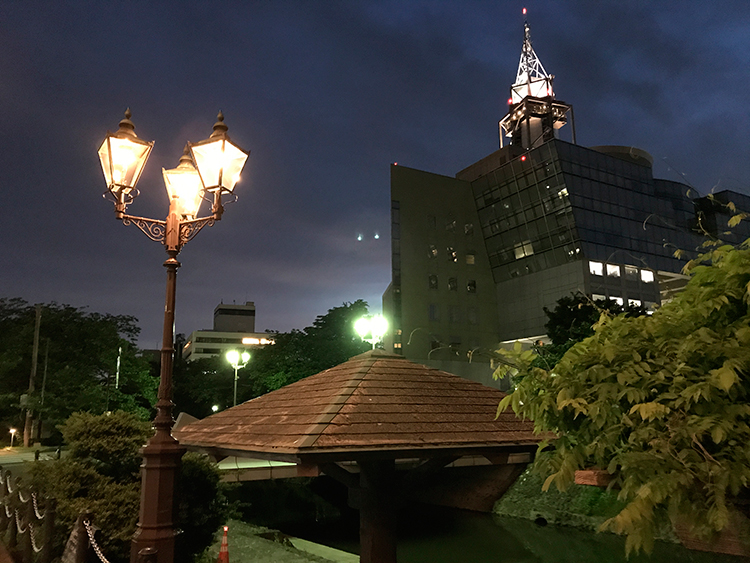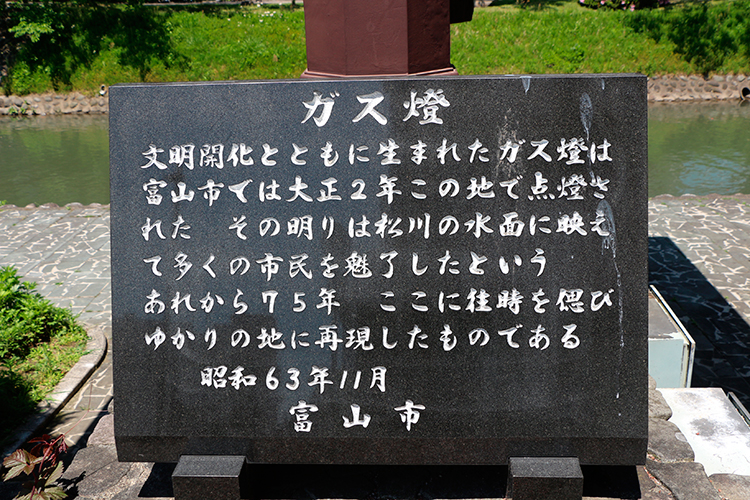 文明開化とともに生まれたガス燈は、富山市では大正2年に、神通川べり(現在の松川べり)で点燈されました。その明りは、水面に映え、多くの市民を魅了したといいます。昭和63年に、国際ロータリー第261地区(現在の2610地区)が寄贈し、往時の姿が再現されました。設計・工事は、日本海ガス㈱。なお、近くの華明橋にも同じデザインの電燈がつけられています。