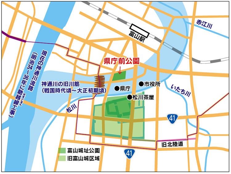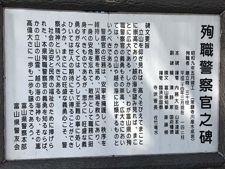 県庁前公園は、昭和40年(1965年)に県民の憩いと語らいの場となることを目的として、戦災復興土地区画整理事業により整備された近隣公園で、敷地面積は、1・2ヘクタール。中央に、直径35mの大噴水があり、花時計もあります。県庁、県民会館や富山市役所、富山電気ビルデイングなどと同様、旧神通川の廃川地跡を埋め立てた場所にあります。敷地内には、昭和9年5月に竣工した、殉職警察官之碑もあります。