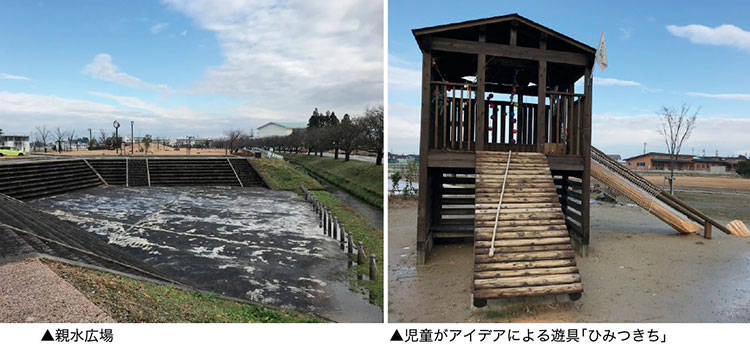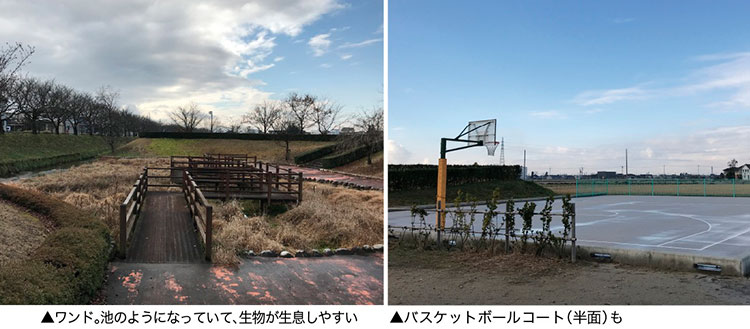 園内では、水辺に近づける階段護岸や、親水広場、ワンド(川とつながっている水がよどむ所)など、河川公園ならではの施設が目を引きます。ボルダリング壁や丸太の滑り台がある遊具は、「こども公園部長」の舟橋小児童が考えたそうで、「ひみつきち」と名付けられているようです。