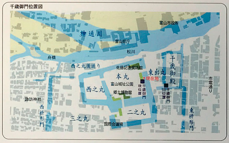 城址公園の東側にある千歳御門は、富山藩10代藩主・前田利保が隠居所として造営した千歳御殿(現在の桜木町の場所にあった)の正門で、嘉永2年(1849年)に建築されました。当時は、今の桜木町内にありました。明治になり、赤祖父家に移されたため、昭和20年8月2日未明の富山大空襲を免れました。