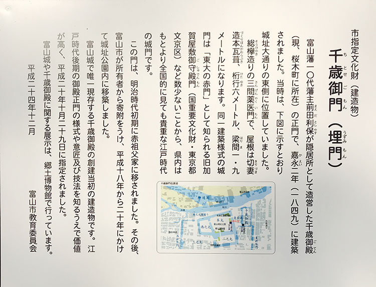 その後、富山市が所有者から寄附を受け、平成18年から20年にかけて城址公園内に移築されました。富山城で唯一現存する千歳御殿創建当初の建造物であり、江戸時代後期の御殿正門の様式や意匠及び技法を知る上で価値が高く、市指定文化財となっています。
