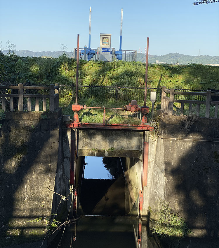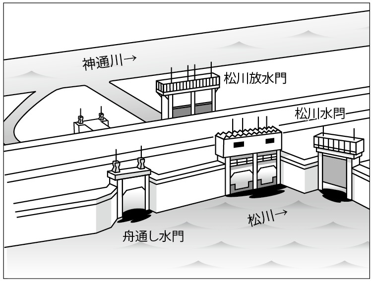 松川の上流、磯部の堤の途中に、松川水門がある。松川の上流からの水量が増えた場合、上の写真の赤い水門を閉じることで、中心部へ流れる松川の水量を止めることができる。水は、左側の2つ開口部のある水門から神通川へと流される。ただし、神通川の水位が高い場合は、逆に松川放水門を閉めなければならないので、神通川へ流せず、赤い水門は開けざるをえなくなる。できるだけそうならないように、2018年9月号で紹介したように、上流の布瀬公園の芝生広場は、調整池機能を持っている。なお、舟通し水門は神通川の漁師さんが松川と行き来するための水門である。