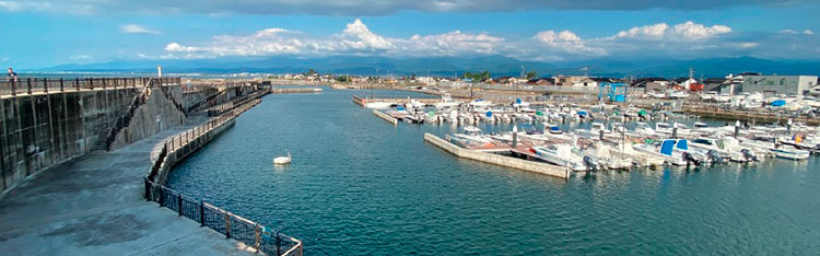 平成7年から整備が始まり、平成23年に「水橋フィッシャリーナ」として開港。ところが、平成29年の台風21号で親水防波堤北側(約40m)が破壊された他、フィッシャリーナ内海上係留施設も破損してしまったそう。平成30年にその改修工事が始まり、平成31年に改修が完了している。
