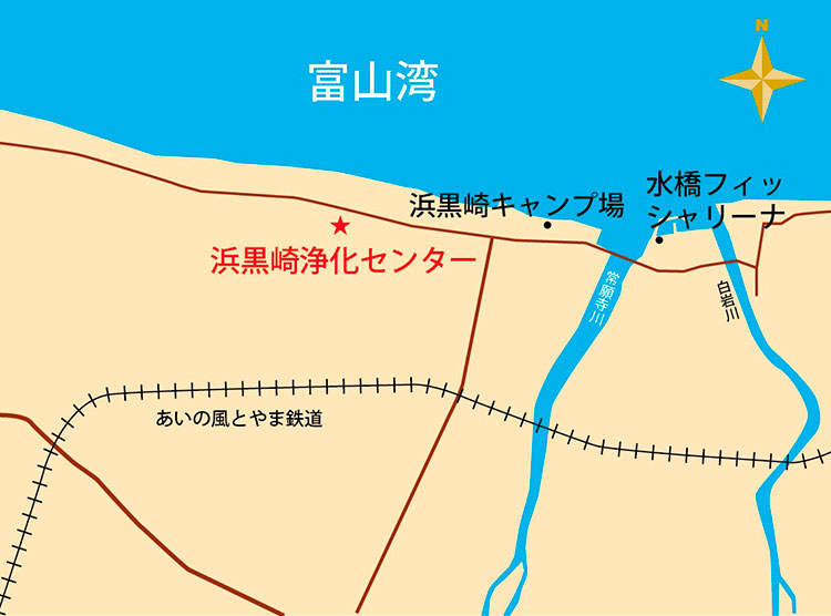 浜黒崎浄化センターと浜黒崎の海辺(富山市)