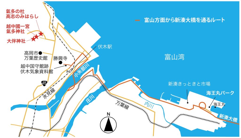近くには勝興寺、万葉歴史館、越中国府跡などがある。富山市からは新湊大橋経由で行ってみるのもよさそうだ。