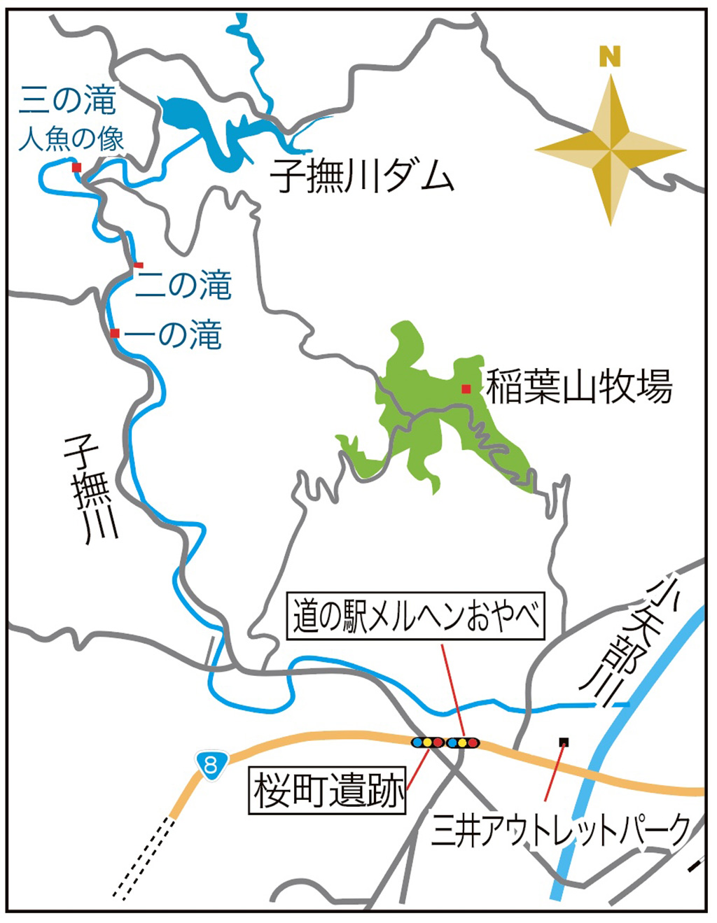 子撫川沿いの宮島峡は県定公園として整備されており、下流側から「一の滝」「二の滝」「三の滝」と3つの滝を楽しむことができます。