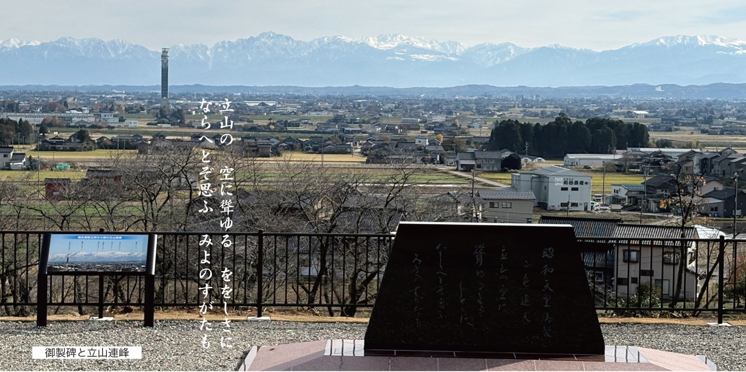 大正13(1924)年11月3日、摂政宮裕仁親王(後の昭和天皇)は陸軍特別大演習の統監の為、埴生に行啓された。この日は明治天皇の誕生日に当たり、晩秋の空がくまなく澄みわたり、白銀きらめく立山連峰が望まれた。そして、ここからご覧になられたその雄大なる山容に感動され、翌大正14(1925)年1月20日の歌会始の折「山色連天(山色天に連なる)」の勅題(天皇陛下がお定めになる歌の御題)にて上記の歌をお詠みになられた。