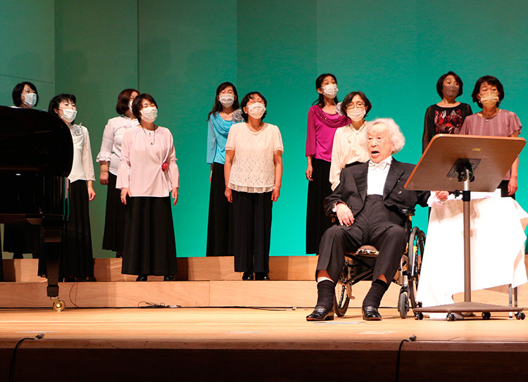 今年、90歳を迎えた浅岡さんは「閉塞しきった生活のなか、日を追うごとに体力を衰え、気力もやせ細っていく。…しかしながら、ひと度音楽に触れれば、その瞬間に目の前は明るく開け、心は沸き立ち、身体は羽が生えたように軽やかに動く」と、心情を吐露。バリトン独唱では、浅岡さんの力強い歌声が響き渡り、会場から盛んな拍手が送られた。