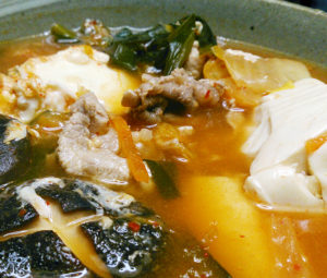 1.鍋に水を入れ、火にかけ温め、豆腐、豚バラ、ニラ、椎茸を入れる。