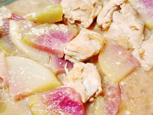 3.フライパンで鶏肉をこんがり焼き、大根を入れて、さらに炒める。