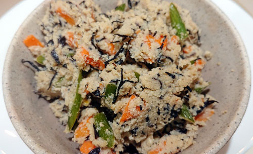 4.そこにヒジキを入れ30秒くらい炒めたら、おからパウダーを加え炒める。