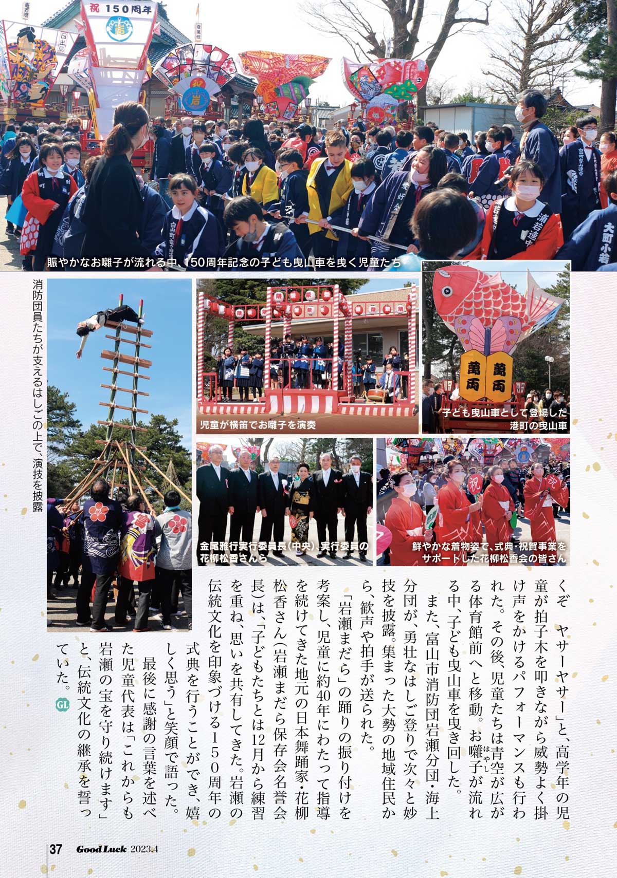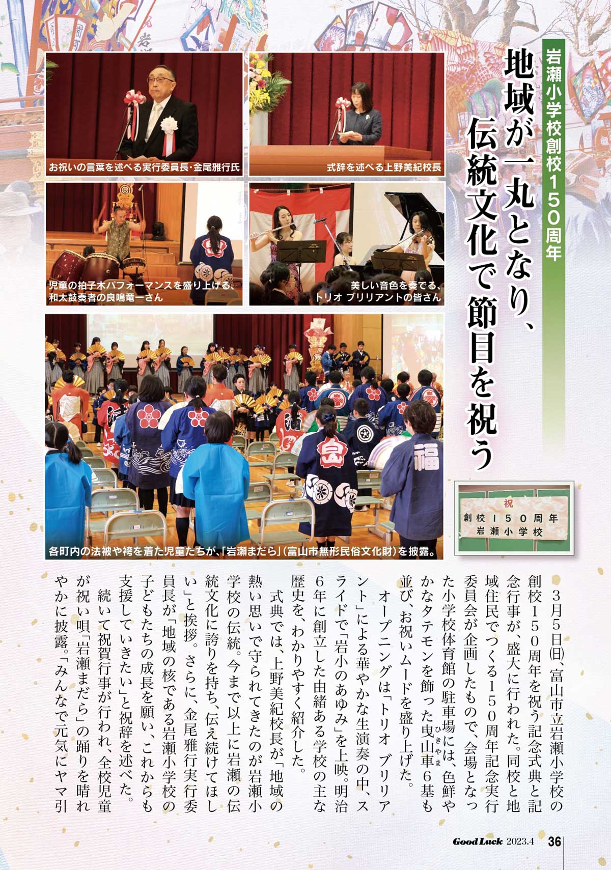 3月5日㈰、富山市立岩瀬小学校の創校150周年を祝う記念式典と記念行事が、盛大に行われた。同校と地域住民でつくる150周年記念実行委員会が企画したもので、会場となった小学校体育館の駐車場には、色鮮やかなタテモンを飾った曳山車6基も並び、お祝いムードを盛り上げた。