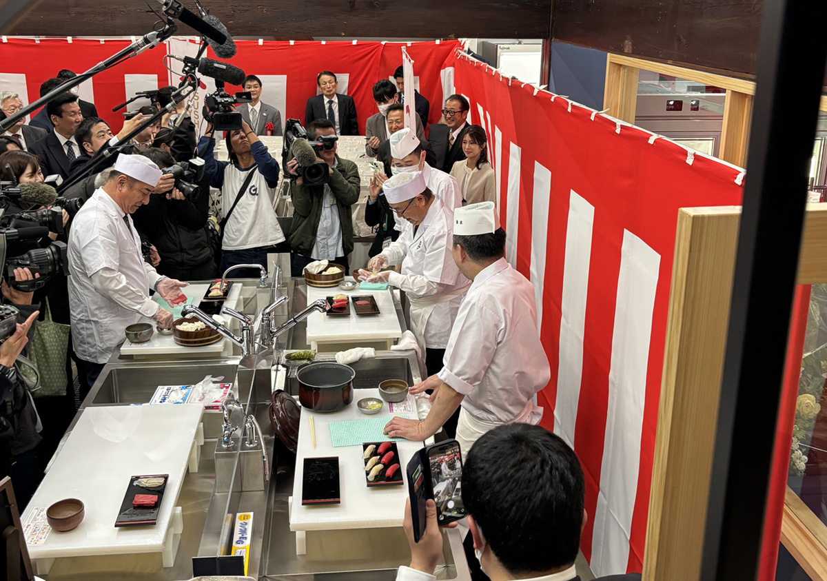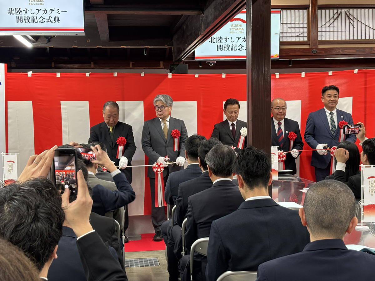 富山市岩瀬に寿司職人育成のための訓練校が完成し、3月5日㈭に開校記念式典が開催された。関係者ら約40人が式典に参列。アカデミーの概要紹介から、広島順三校長を始め講師陣の紹介、内覧会もあり、式典後のデモンストレーションでは新田知事が寿司を握る姿を披露。3月9日㈪から第一期生のカリキュラムが受講生7名でスタートする。カリキュラムは2カ月間。寿司の握り方だけでなく、朝競りに行き、仕入れの仕方から学び、農業でいうところのFarm to Tableになぞらえ、“海からカウンターまで”をカバーする包括的な指導をする。職人の育成のみならず、釣り人や観光客に魚の捌き方教室も提供し、岩瀬ならではの地理的特性を活かした食文化発信の拠点となる。