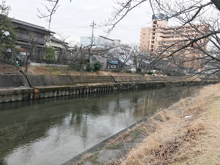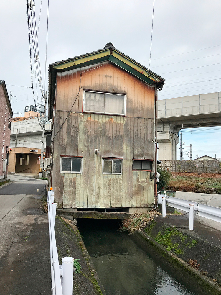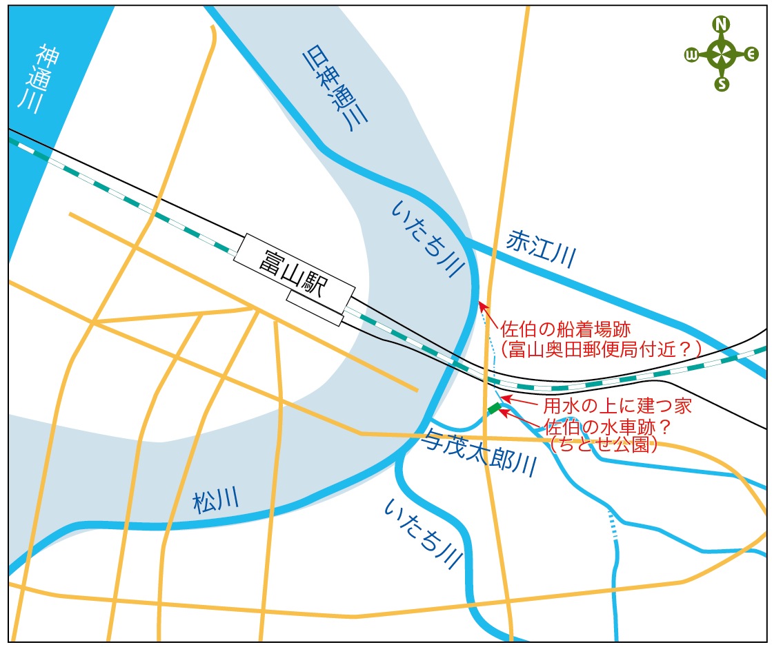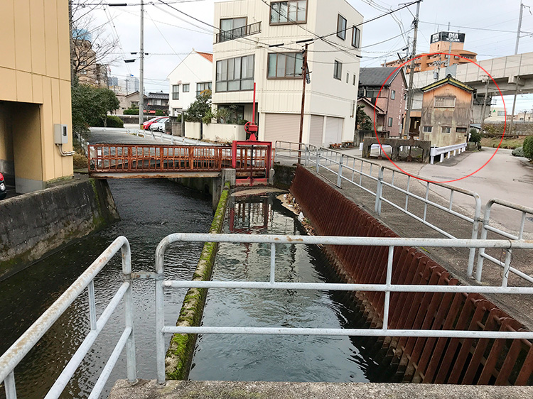 小誌の今年2月号の『とやまの話』コーナーで、「富山町の水車」をお取り上げしたが、どこかにその痕跡がないものかと思っていたら、いたち川に注ぐ与茂太郎川(いたち川上流の〝どんどこ〟の付近から取水している奥田用水の流れ末?)の沿線にそれらしき形跡を発見した。一つが、「ちとせ公園」。下を与茂太郎川が流れている。もう一つが、与茂太郎川から分かれて、昔、佐伯の船着場があったという場所の方向に流れている水路の上にある家。与茂太郎川には、県立中央病院北側を流れる水路からの水も入っているが、その沿線上にも水車があったようだ。何か案内があればいいのにと思った。
