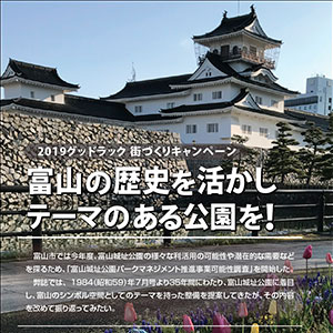 2019グッドラック 街づくりキャンペーン 富山市では今年度、富山城址公園の様々な利活用の可能性や潜在的な需要などを探るため、「富山城址公園パークマネジメント推進事業可能性調査」...