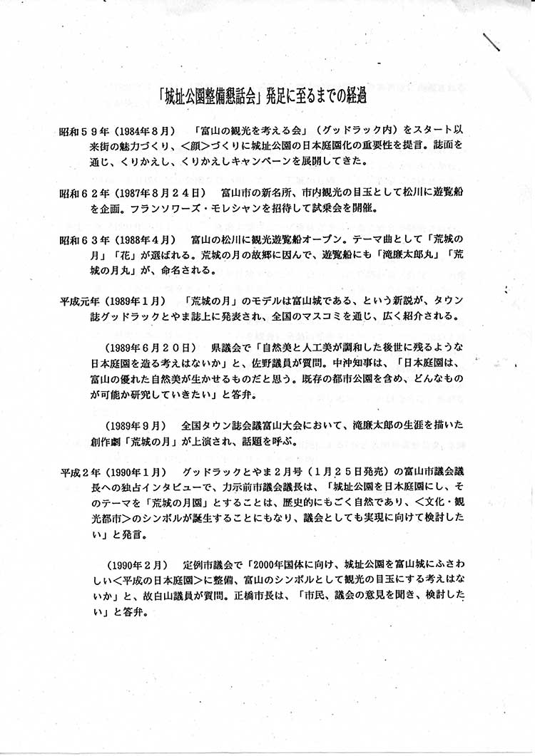 「城址公園整備懇話会」役員(案)と、「城址公園整備懇話会」発足に至るまでの経緯
