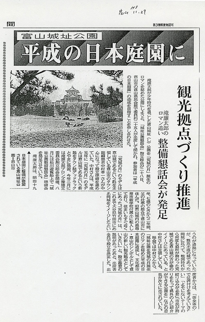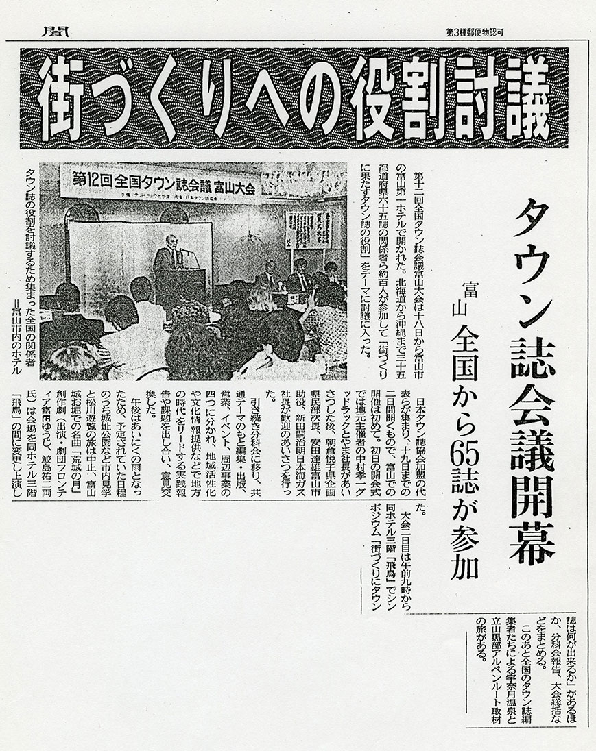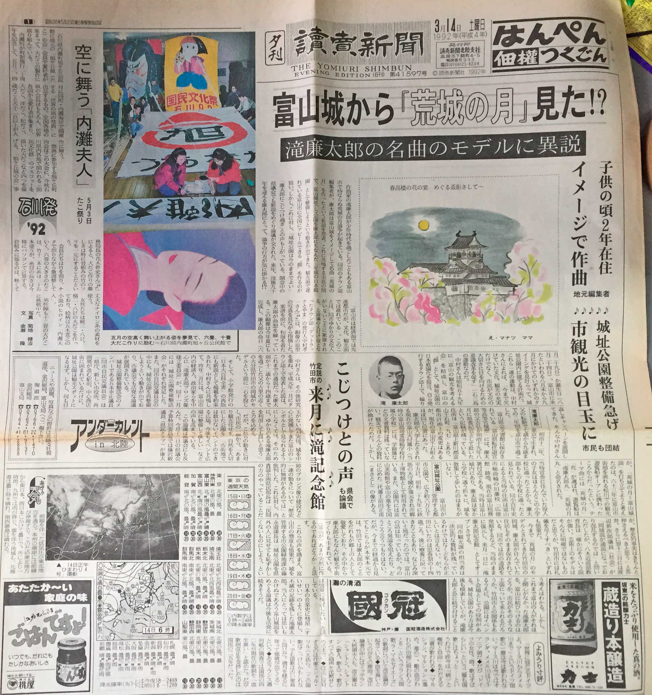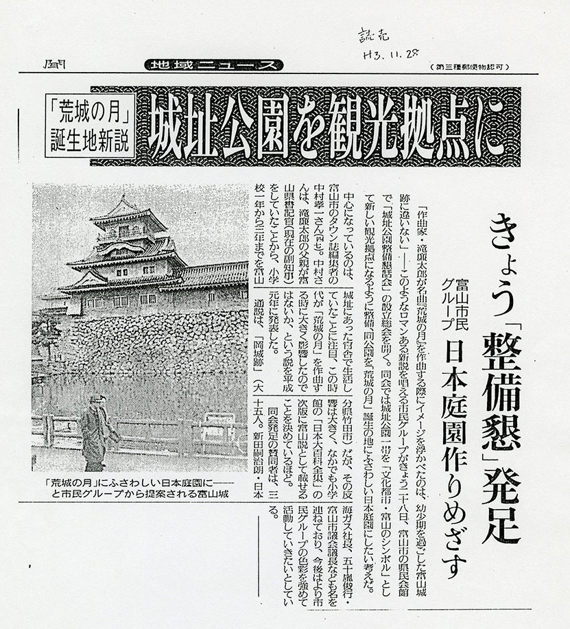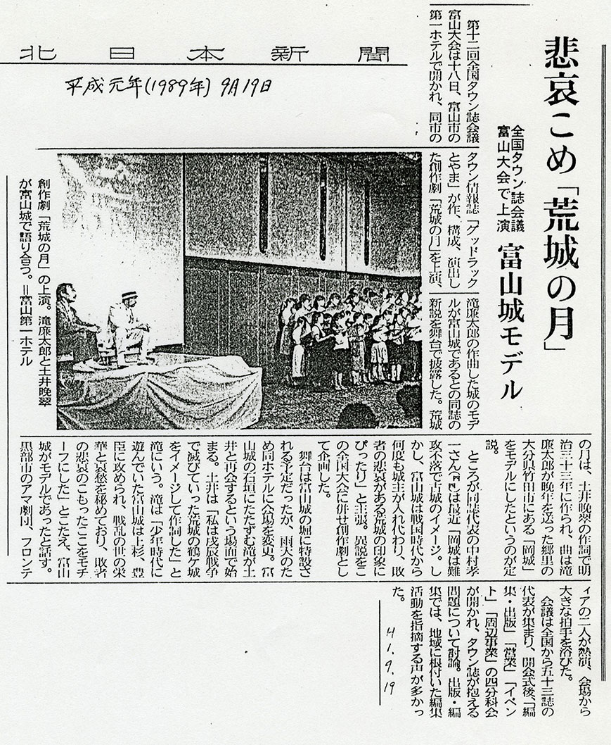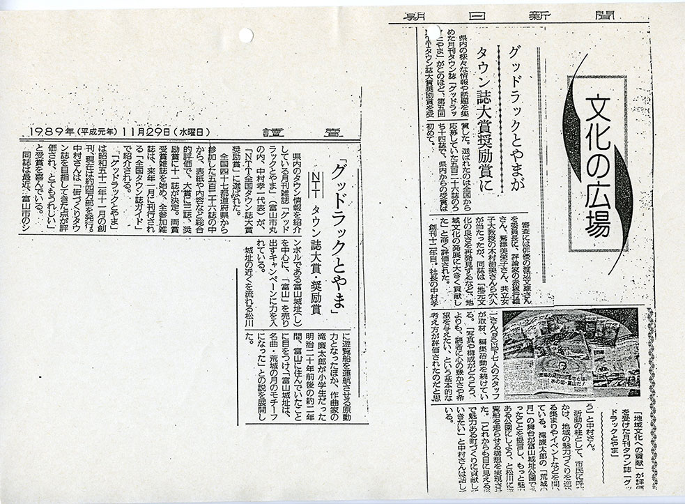 「全国タウン誌会議」「”荒城”は富山城!?」「タウン誌奨励賞」「城址公園を観光拠点に」「城址公園を日本庭園に」「初の滝廉太郎祭」「滝廉太郎記念館オープン」など、グッドラックのまちづくりへの取り組みが紹介された新聞記事です。