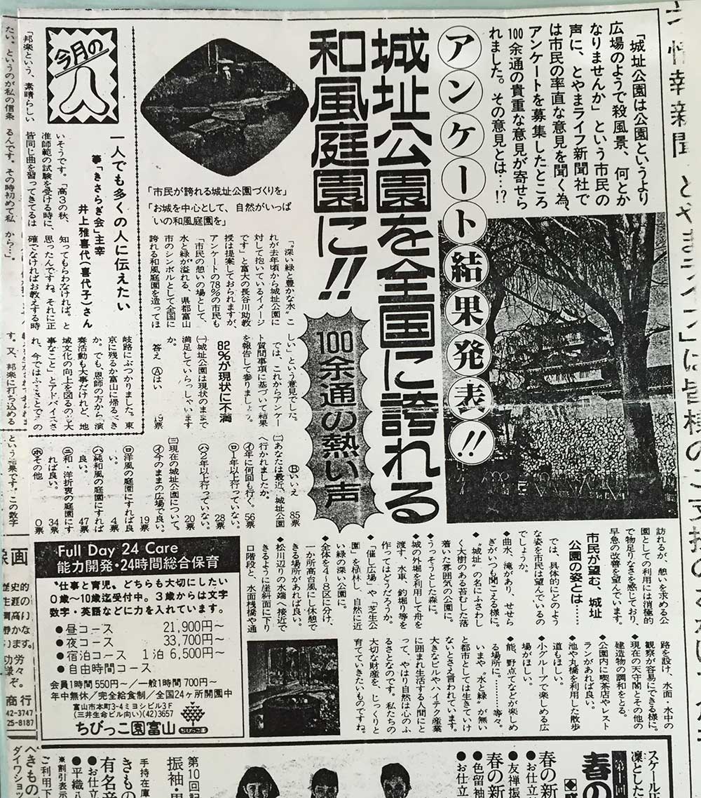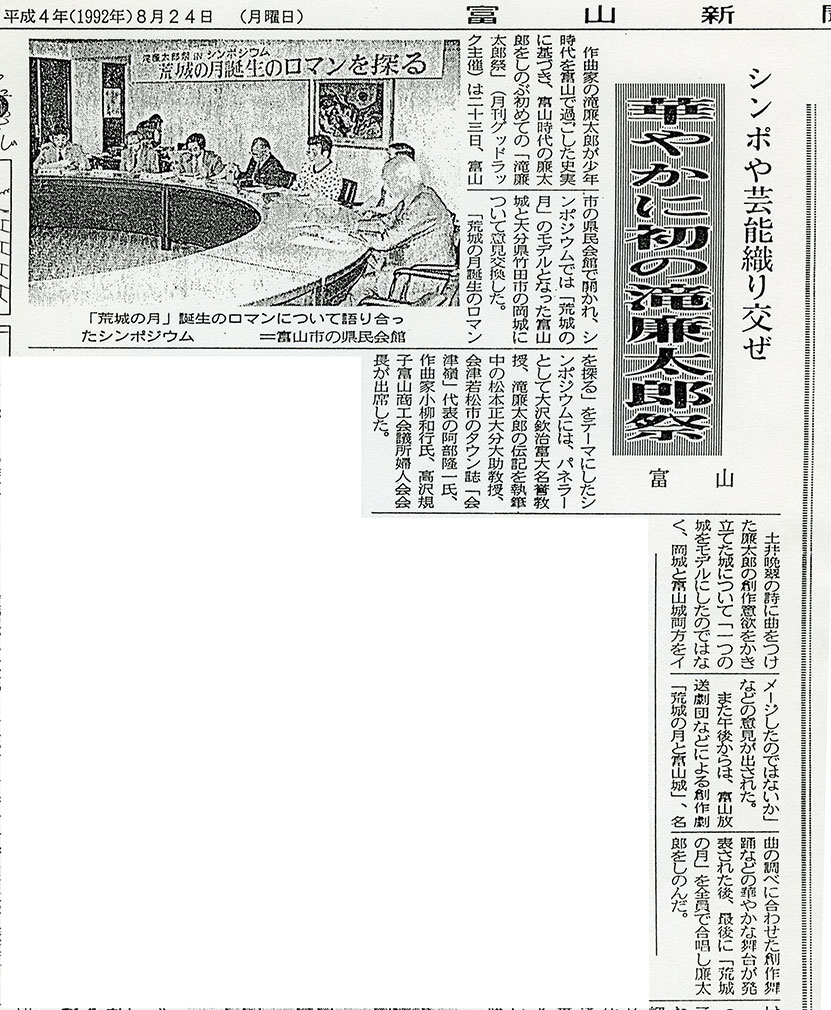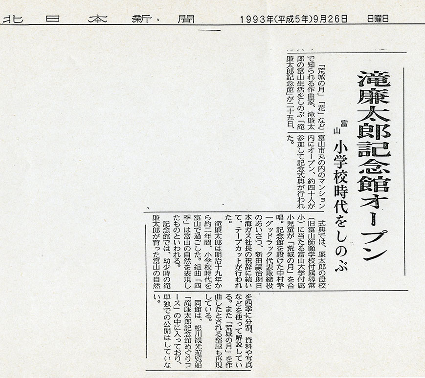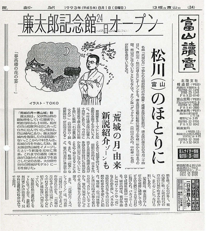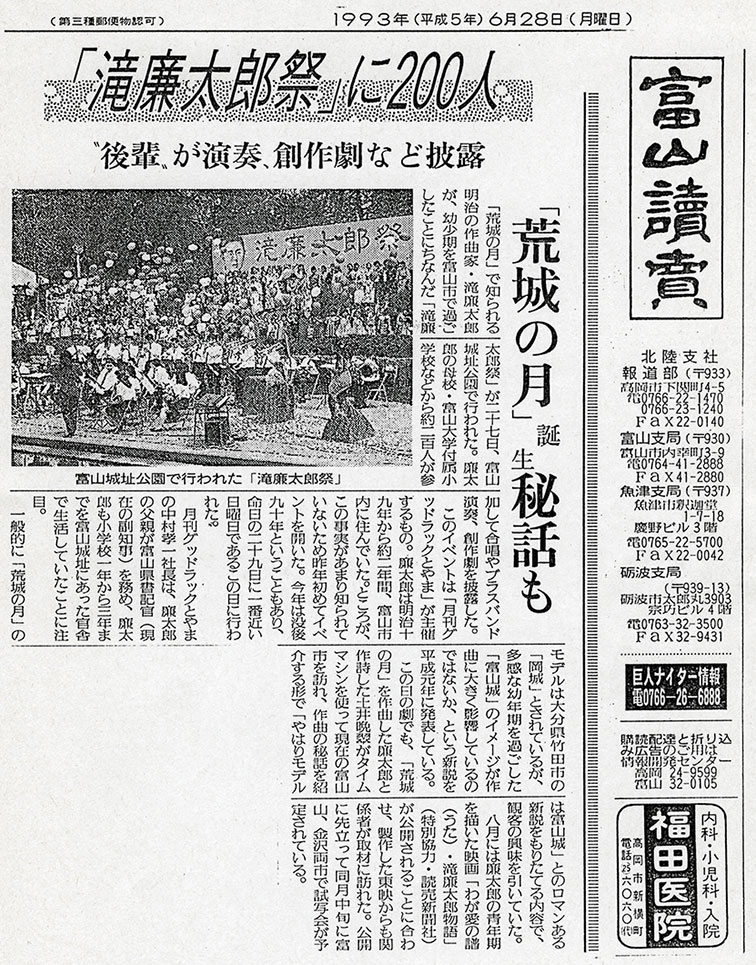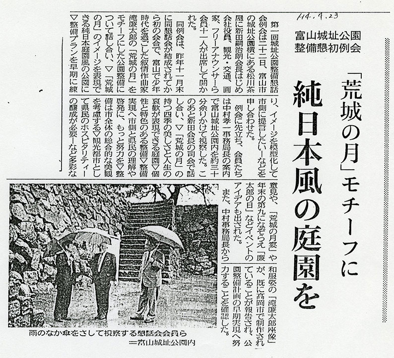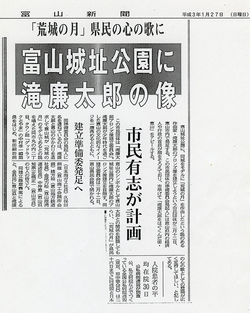 「全国タウン誌会議」「”荒城”は富山城!?」「タウン誌奨励賞」「城址公園を観光拠点に」「城址公園を日本庭園に」「初の滝廉太郎祭」「滝廉太郎記念館オープン」など、グッドラックのまちづくりへの取り組みが紹介された新聞記事です。