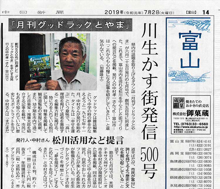「月刊グッドラックとやま」川生かす街発信 500号 松川活用など提言(2019/7/2 北陸中日新聞)