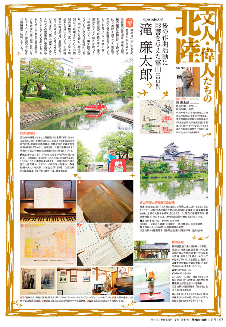 JR西日本発行の「西Navi北陸」11月号、文人・偉人たちの北陸に、滝廉太郎資料室と松川遊覧船を掲載いただきました! by goodluck · 公開済み 2018.11.01 · 更新済み 2021.1.18 ・リンク