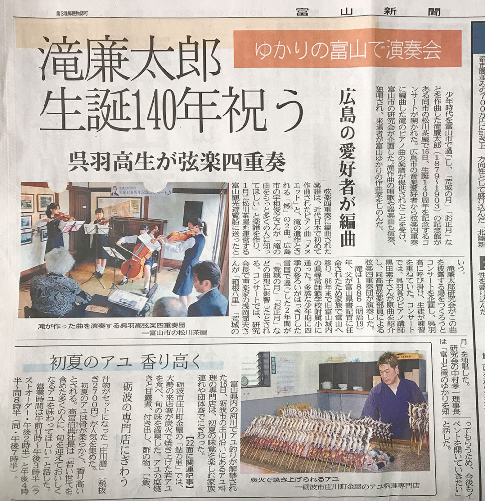 滝廉太郎研究会 生誕140周年記念コンサート(2019/6/17 北日本新聞、富山新聞) by goodluck · 公開済み 2019.6.17 · 更新済み 2019.6.26 ▲北日本新聞 ▲富山新聞 当日の模様をYouTubeでご覧頂けます。(リンク)