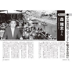 富山市長 森 雅志 さん Masashi Mori 神通川によって生まれ、神通川と共に育ってきた〝水の都・富山〟。富山城の外堀だった神通川は、松川・いたち川と姿を変え、富山発祥の地としての歴...