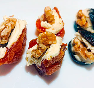 レシピ&写真提供:新村こうじみそ商店 新村弘之さん ・材料(1人前)・ ・クリームチーズ 40g ・味噌 小さじ1/2 ・干し柿 1〜2個 ・ドライイチヂク 2〜3個 ・クルミ 適量